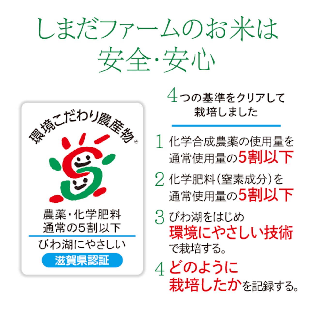 農薬・化学肥料を通常の半分にまで減らした滋賀県「こだわり農産物」の認証を受けたお米だから安心・安全です。