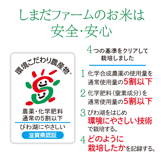 農薬・化学肥料を通常の半分にまで減らした滋賀県「こだわり農産物」の認証を受けたお米だから安心・安全です。
